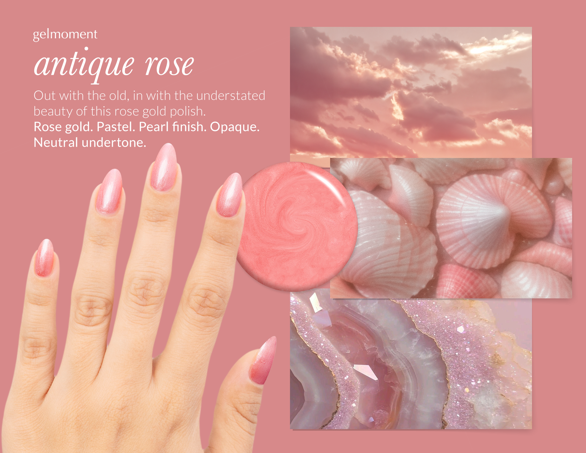 Out with the old, in with the understated beauty of this rose gold polish.Rose gold. Pastel. Pearl finish. Opaque. Neutral undertone.